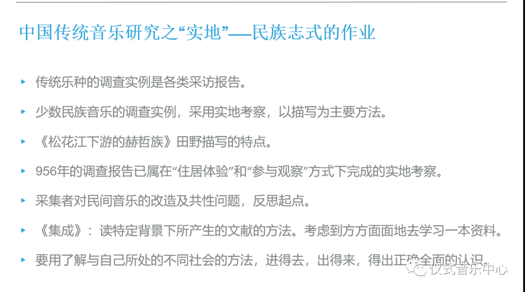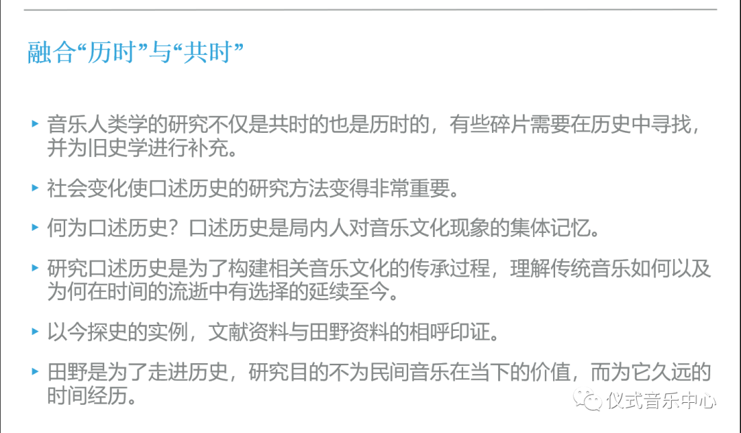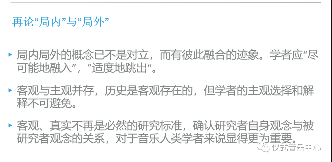 所以说,从学科史看方法,我们要去描述和阐释一个音乐文化,无论如何就是强调你所有的表达背后都包含了一个方法,方法论决定了你的表达,不管是客观的也好,还是主观的也好。