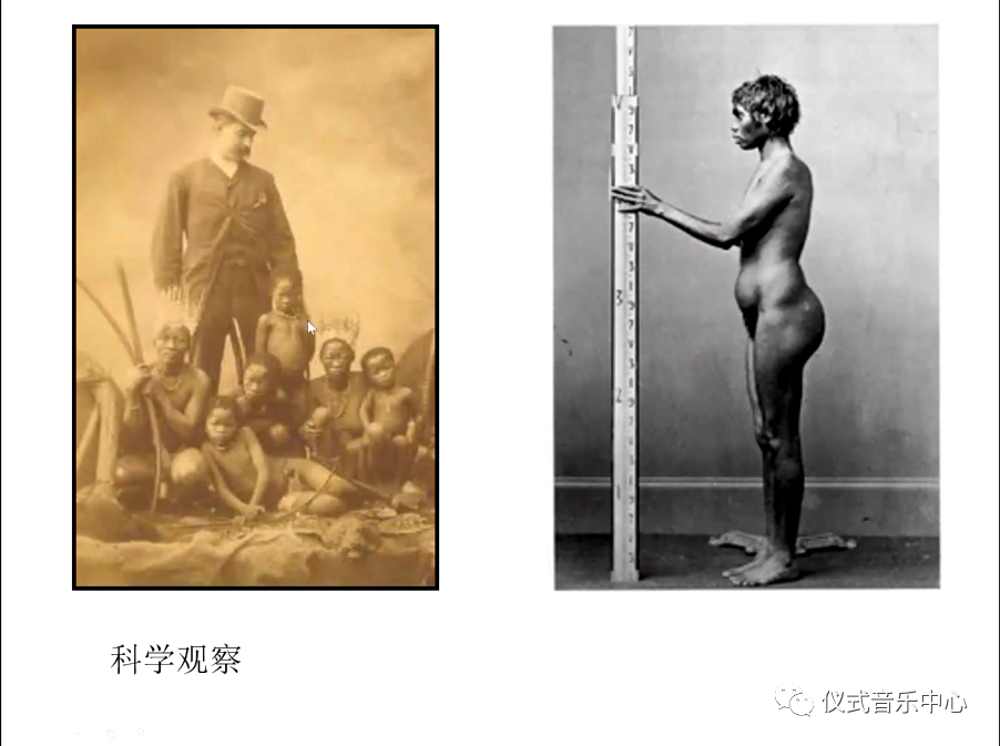 我们当时的科学考察到部落里,我们从照片就可以看出来,他们当时是什么眼光看“他者”,而不是像现在把“他者”当作“us”,这是不一样的。照片里面白人是“big man”,然后原住民都是小黑人,另外一张图片虽然是体质人类学。但我们做音乐研究的时候也会这样,我们把记谱记下来,对它进行我们的乐理分析,因为我们在分析乐谱的时候不会想到这样一幅图画,这会掩盖掉很多东西,我们仅仅把谱子分析出来,就说这是哈萨克人音乐,够不够?如何知道他们的音乐分类?怎么理解不同的定弦?如果你不知道文化,即便记写了同样的音高,可你不知道哪些曲目是局内人所区别的“柔软”和“硬的”。你只有走近他们的文化,才能更深入。因此,我们在做学科梳理的时候一定要去看他的方法论。