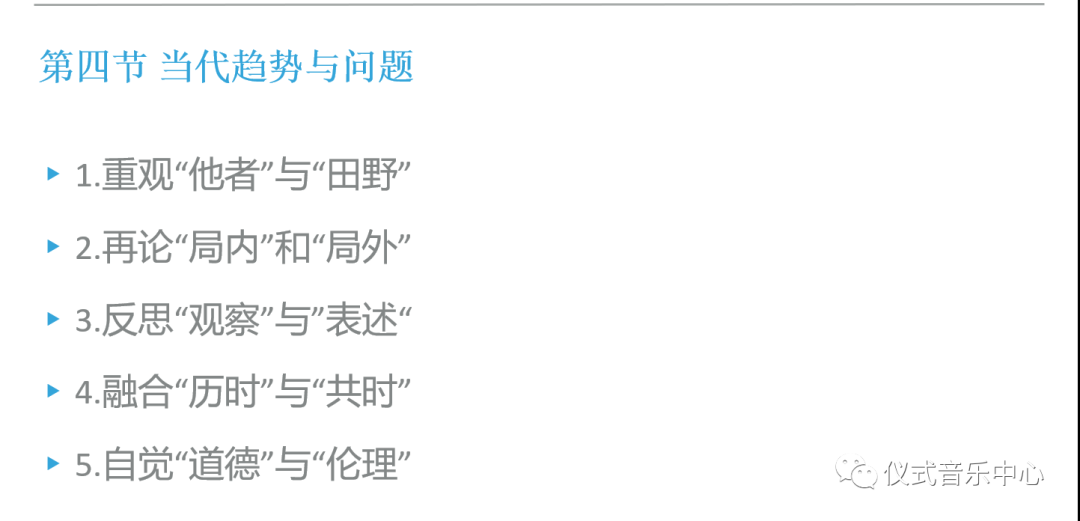 首先是重观“他者”与“田野”。作者在这里界定了“他者”(与“自我”母体文化相异的群体)与“田野”(泛义的场域概念)的概念。当我们现在出现了更多家门口的田野以及城市音乐文化的研究的时候,可以试着用这种方式来定义“他者”与“自我”。