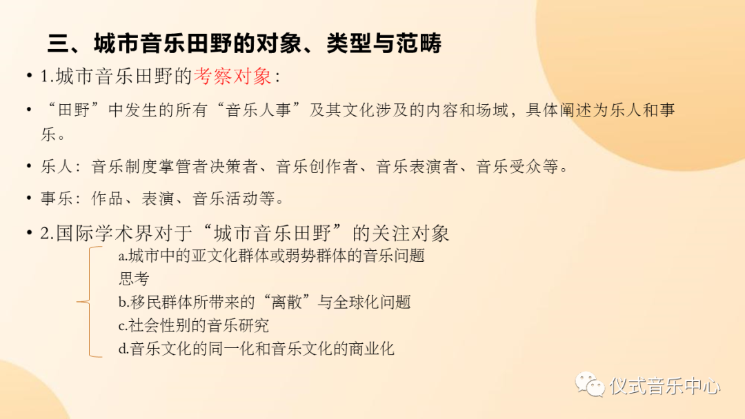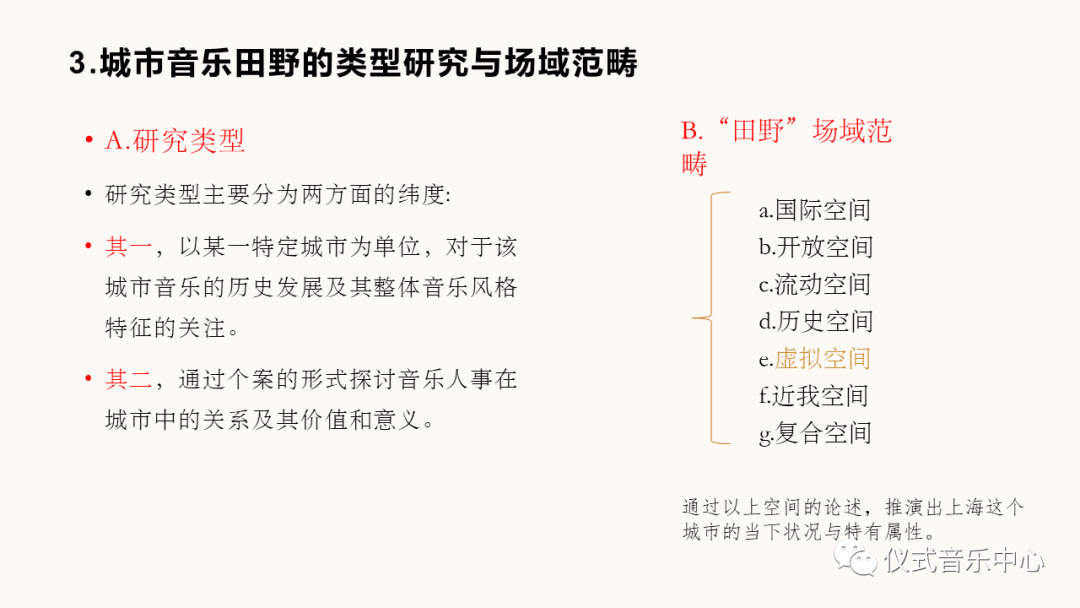第三个部分的最后,作者根据研究对象的不同,对城市音乐田野的“研究类型”与“田野”场域范畴也做了分类。如ppt所示: