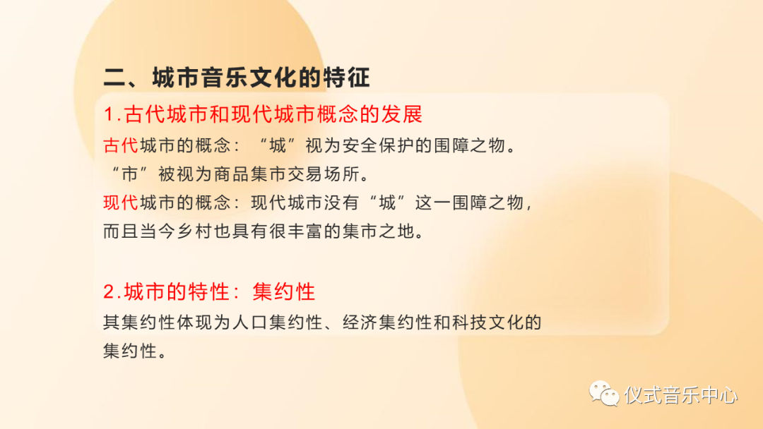 文章的第二部分是城市音乐文化的特征,作者介绍了“城市”这一概念从古代至现代的变迁。而城市的主要特征为“集约性”。