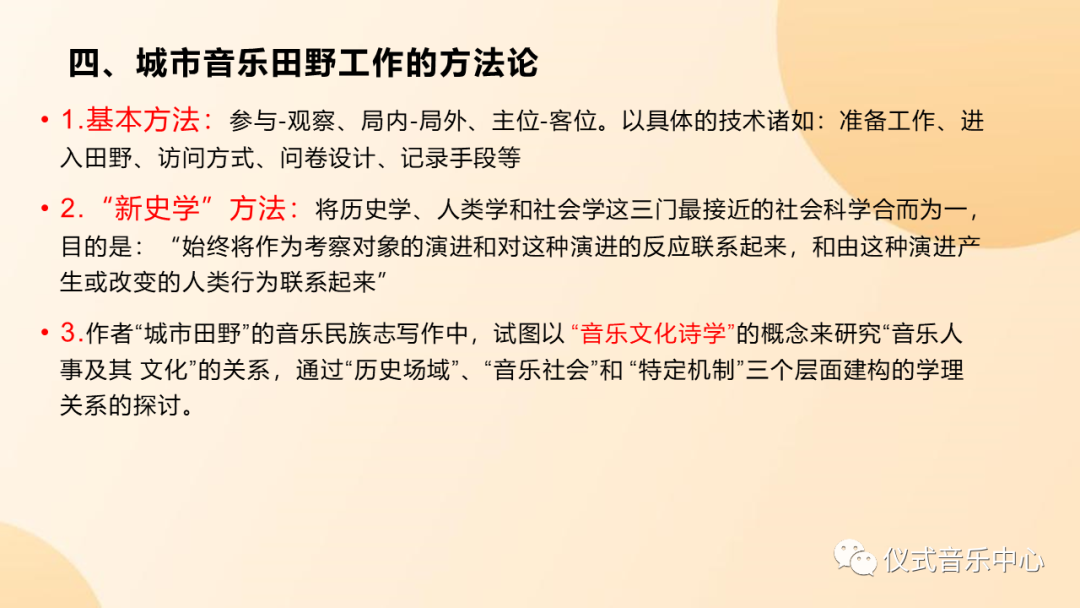 文章的第一部分,我们小组根据音乐人类学“田野概念”的变迁,做了一个概括。如ppt所示: