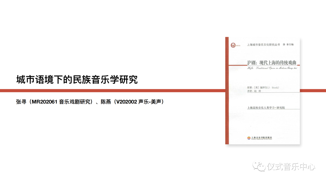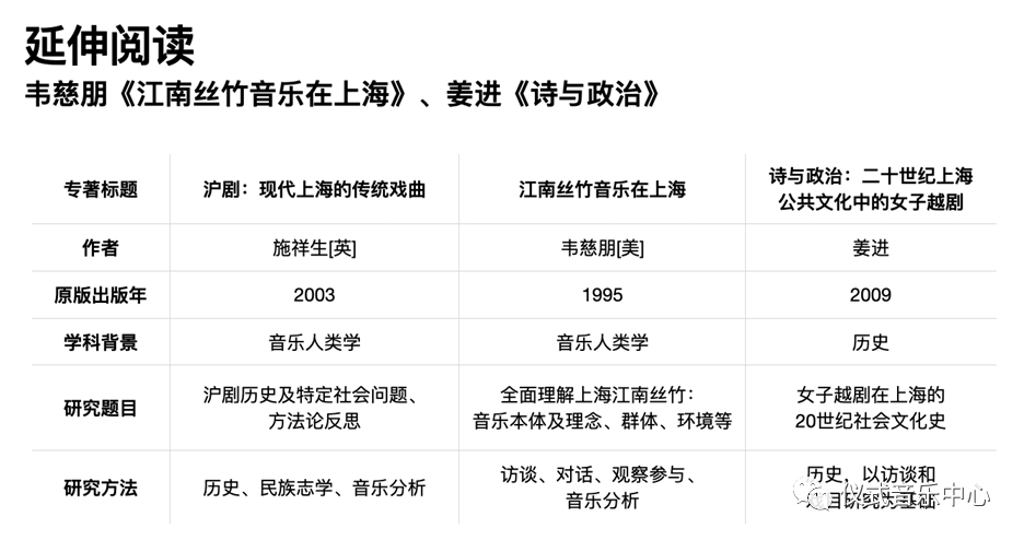 对于本材料内容的汇报就到这里。那么基于本材料关注的研究主题与研究方法之关系,我们小组将其与相近主题的韦慈朋《江南丝竹音乐在上海》和姜进《诗与政治》两部专著进行比较。