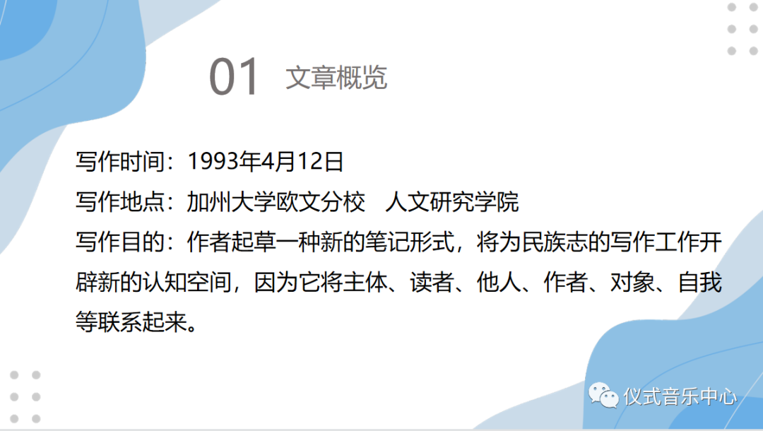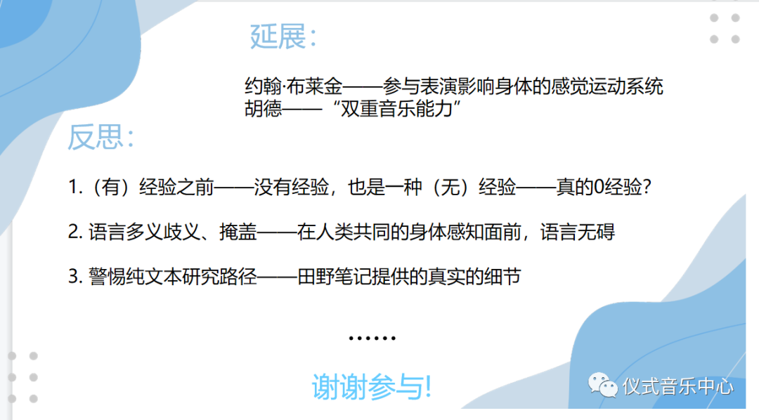 课上,同学们以专题汇报以及理论研讨的方式参与课程学习,仪式音乐中心也将陆续推出同学们在课上的汇报内容,敬请关注!