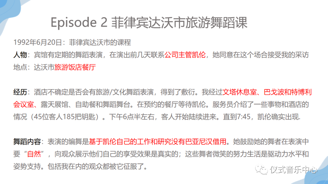 在作者第二次的田野日记中,我们看到作者在另外一个地方体验了舞蹈课。ppt所呈现的,是作者在体验中所感受到的一些内容: