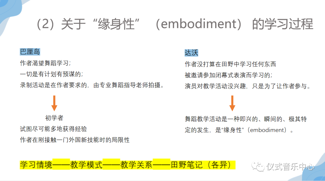作者强调,在这两次田野中,这种“缘身性”(embodiment)的体验过程所体现的是:不同的学习情境,决定了不同的教学模式和教学关系,也决定了田野笔记是怎样的。所谓“缘身”的笔记,是指那些没有用文字记录下来但保存在身体记忆中的笔记。与其说反映了新手的第一次遭遇,不如说反映了一种更为深刻而熟悉的关系。这种熟悉关系是在短暂的、具体化的亲密关系中进行的,所以人在主观上就很难忘。因为它包含了一个从0到1的经验习得过程和质变。作者说这是一种未成形的经验,是一种不接触你就不会获得的知识。而在田野中,只有在描述几个专业术语和数拍子的时候,语言才起到有限的作用。更多时候口头交流并没有那么重要,他们无需语言表达,而是通过观察身体的动作,以及舞蹈本身的运动来实现“缘身性”(embodiment)。