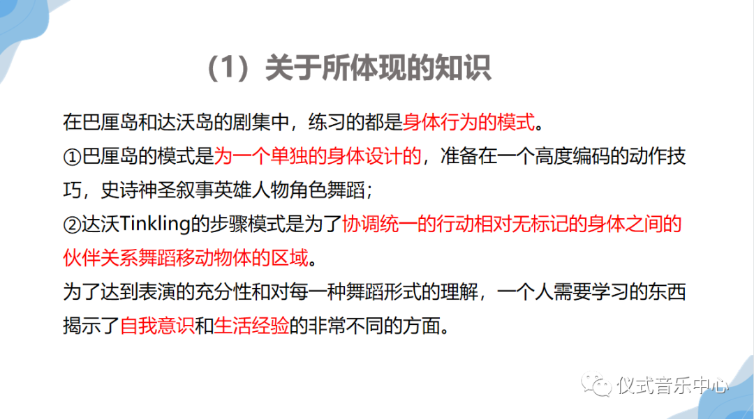 第一部分是关于所体现的知识。作者通过两次不同的舞蹈学习认识到,在学习过程中,为了充分表演和理解每一种舞蹈,其中所要弥补的知识以及在这个过程中体现出的差异,都揭示了不同的认知和生活经验。