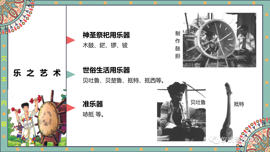 乐之艺术根据用途场合的不同分为“神圣祭祀用乐器”、“世俗生活用乐器”和“准乐器”三类。