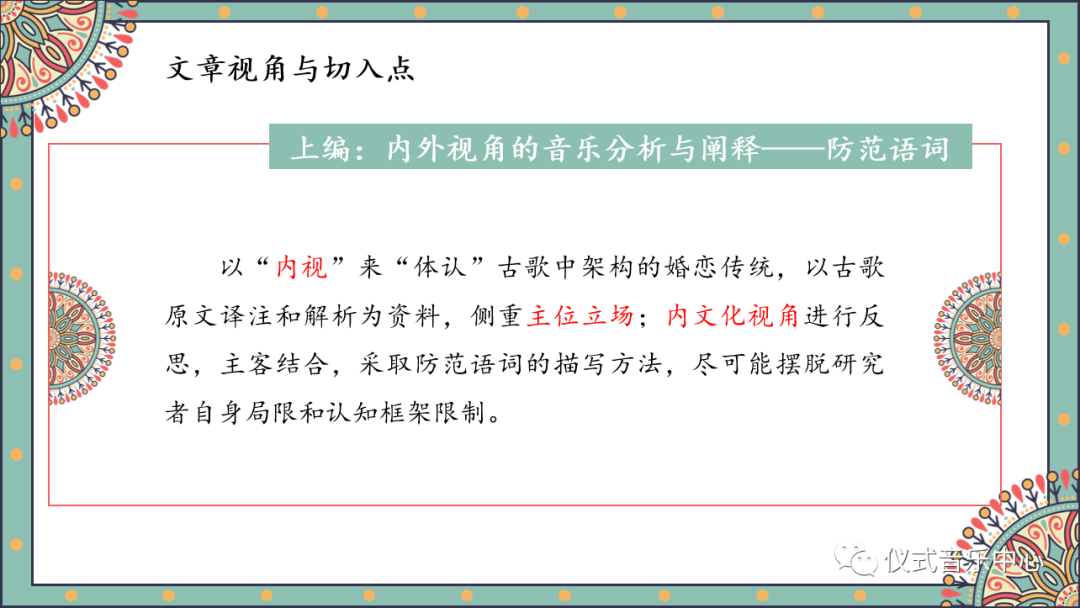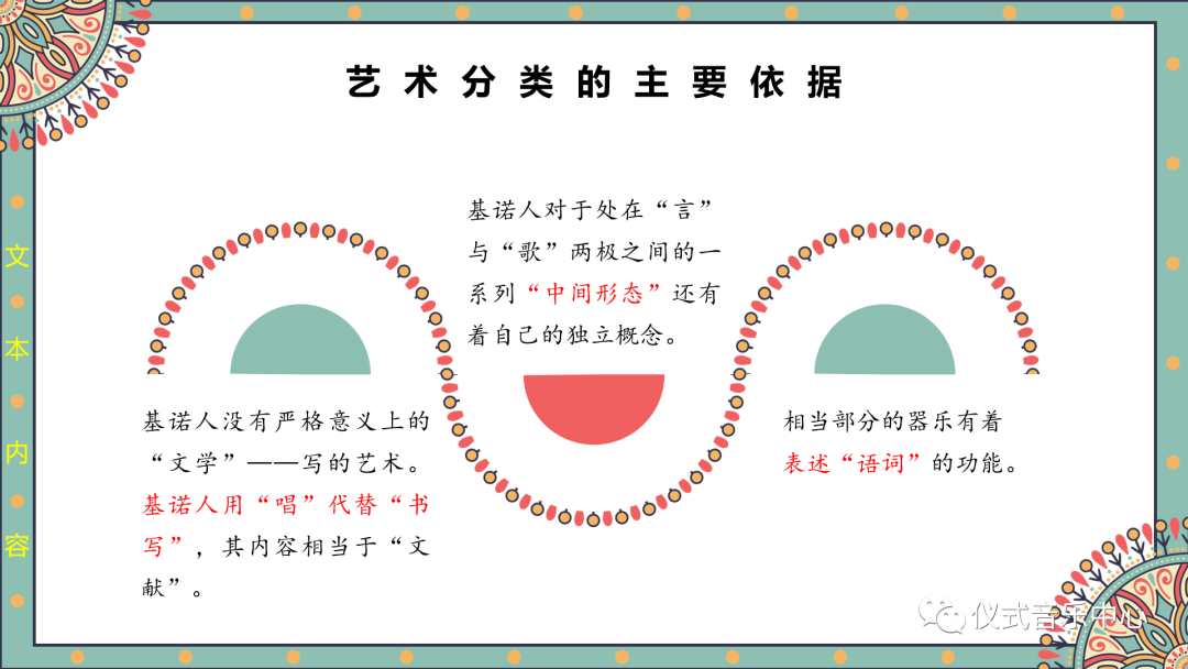 下方PPT是关于《民族音乐志的架构》的文本框架及主要内容。该文主要可分为两大部分,即“基本理论前提”与“具体架构”。作者在“基本理论前提”中,重点讨论了民族音乐学的学科属性。之后,作者重点介绍了他认为民族音乐志的九个重要架构,并具体讨论其中的某些内容。最后,作者总结:“一方面,在具体修志时可以根据情况灵活调整上述架构;另一方面,民族音乐志的每一项的记述和描写,应当尽可能客观、准确、系统和富于典型,却又不忽略种种有意义的例外和细节。”