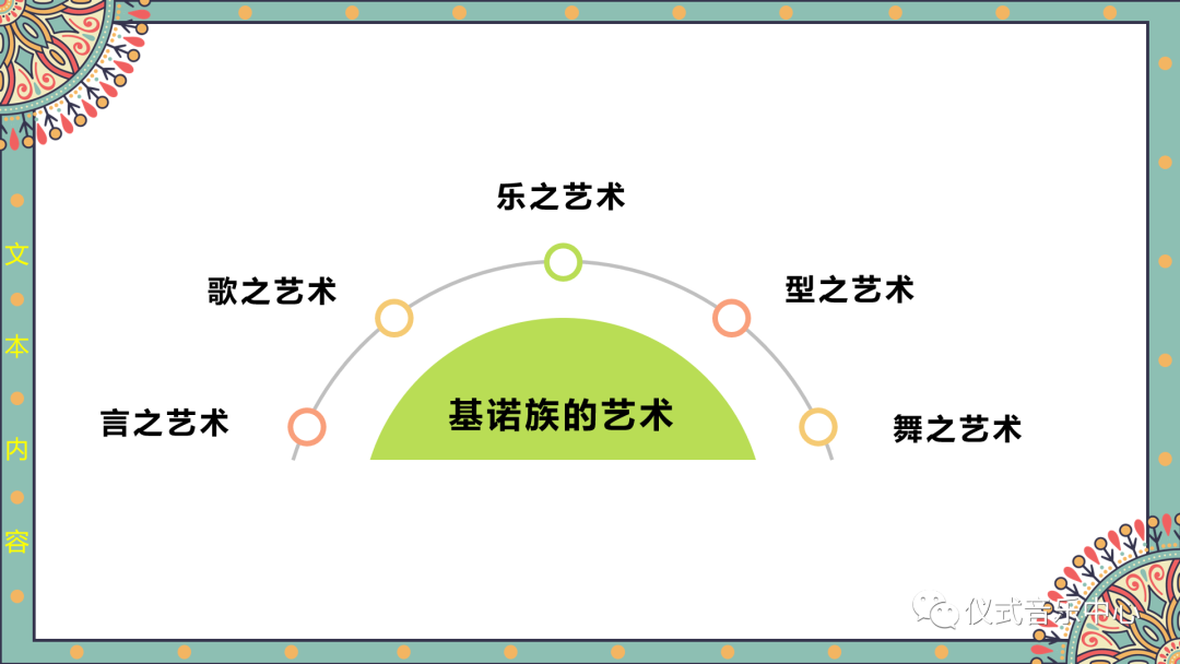 著述的第十章是“艺术”部分。当然,正如之前所说,尽管我们在汇报呈现上是将本书分为“人文”与“艺术”两大部分,但其实二者之间是相互联系的。作者同样也是将基诺族的艺术融入基诺族整个文化背景中介绍。作者将基诺族的艺术分为五个部分:言之艺术、歌之艺术、乐之艺术、型之艺术以及舞之艺术。