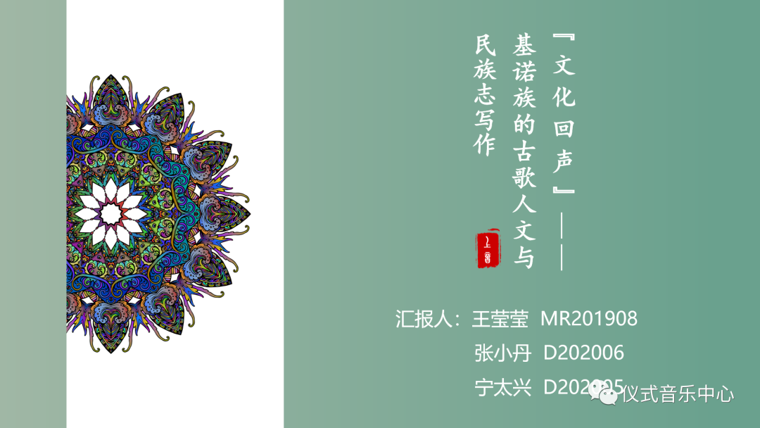 各位同学大家好!我们小组今天汇报的题目是《“文化回声”——基诺族的古歌人文与民族志写作》,这个题目是我们小组整合了著述《贝壳歌,基诺族血缘婚恋古歌实录及相关人文叙事》和期刊论文《民族音乐志的架构》内容后自拟而成的。