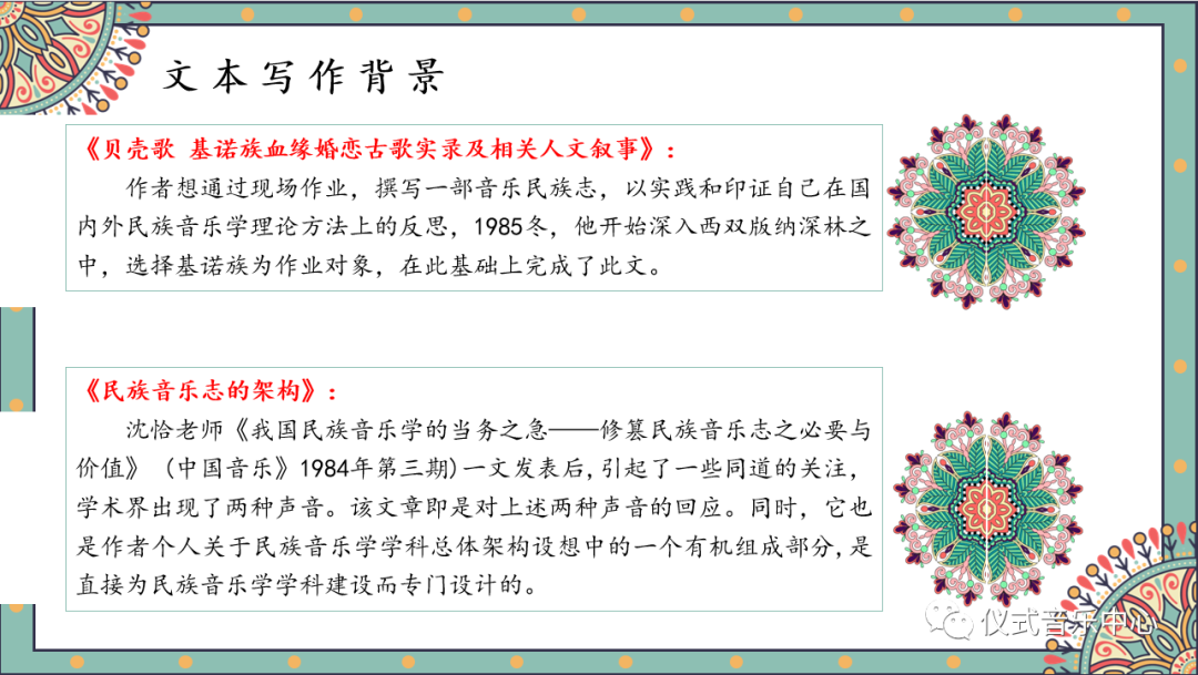 下方PPT是关于《贝壳歌,基诺族血缘婚恋古歌实录及相关人文叙事》与《民族音乐志的架构》的写作背景。
