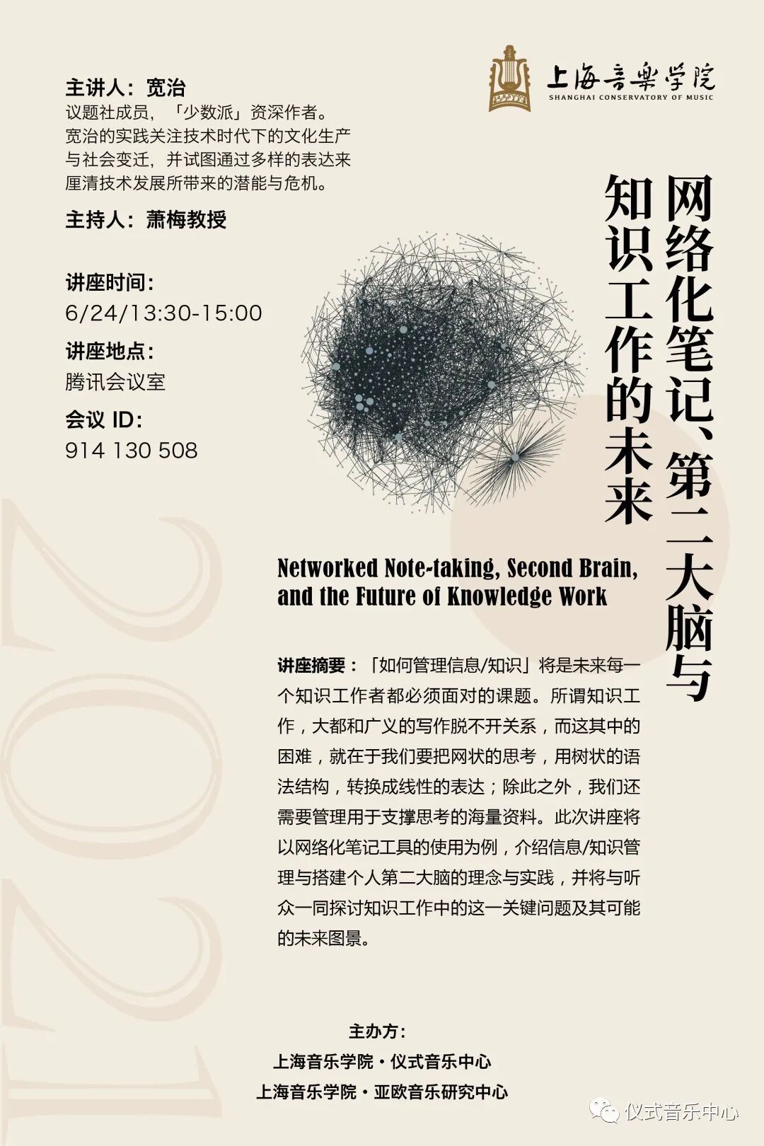 “如何管理信息/知识”将是每一个知识工作者都必须面对的课题。所谓知识工作,大都和广义的写作脱不开关系,而这其中的困难,就在于我们要把网状的思考,用树状的语法结构,转换成线性的表达;除此之外,我们还需要管理用于支撑思考的海量资料。此次讲座将以网络化笔记工具的使用为例,介绍信息/知识管理与搭建个人第二大脑的理念与实践,并将与听众一同探讨知识工作中的这一关键问题及其可能的未来图景。