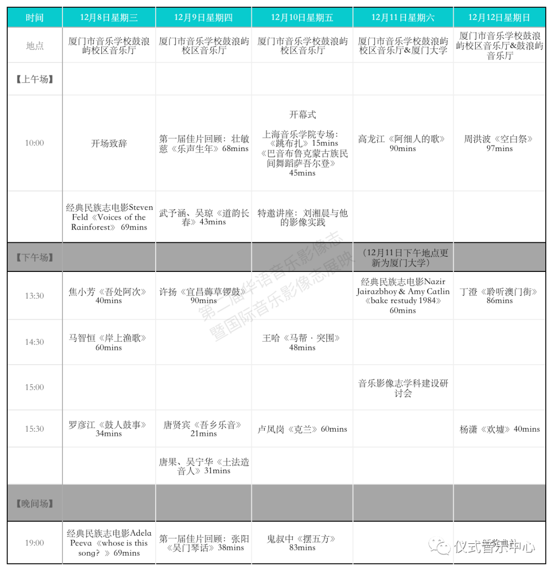 在此次为期5天的展映期间,除了提名影片与特邀影片展映活动外,同时设有“音乐影像志学科建设研讨会”(厦门大学分会场)。并且,在12月12日的颁奖典礼中,组委会也将邀请与展映影片相关的音乐家群体到现场演出。