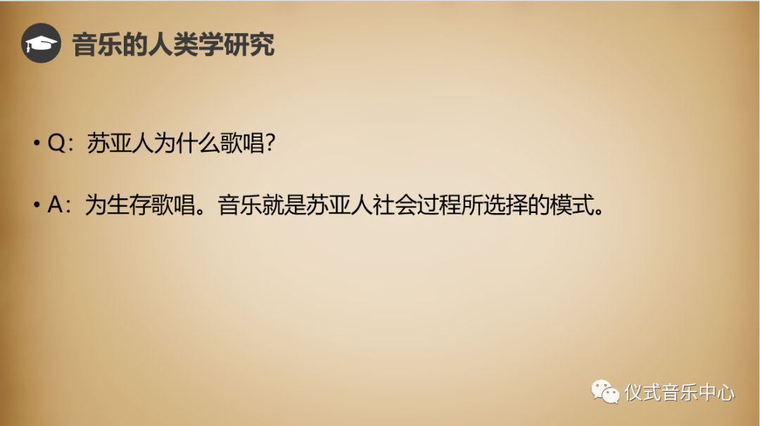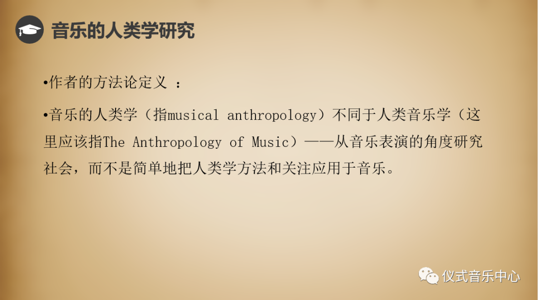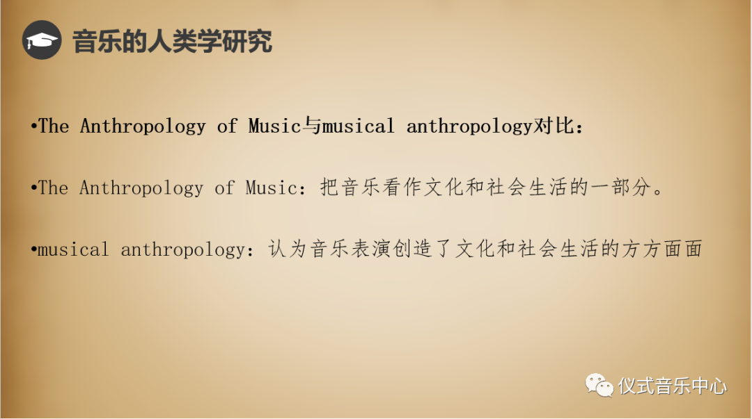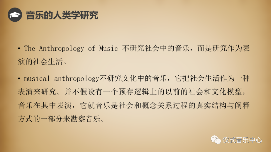 由此我们就可以理解下面的这两句话。The Anthropology of Music 是在梅里亚姆的理念下,将作为表演的社会生活视为某一社会中众多橘子瓣当中的一瓤,而Musical Anthropology把社会生活作为一种表演来研究。