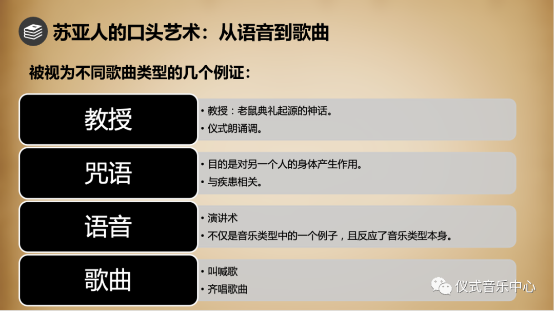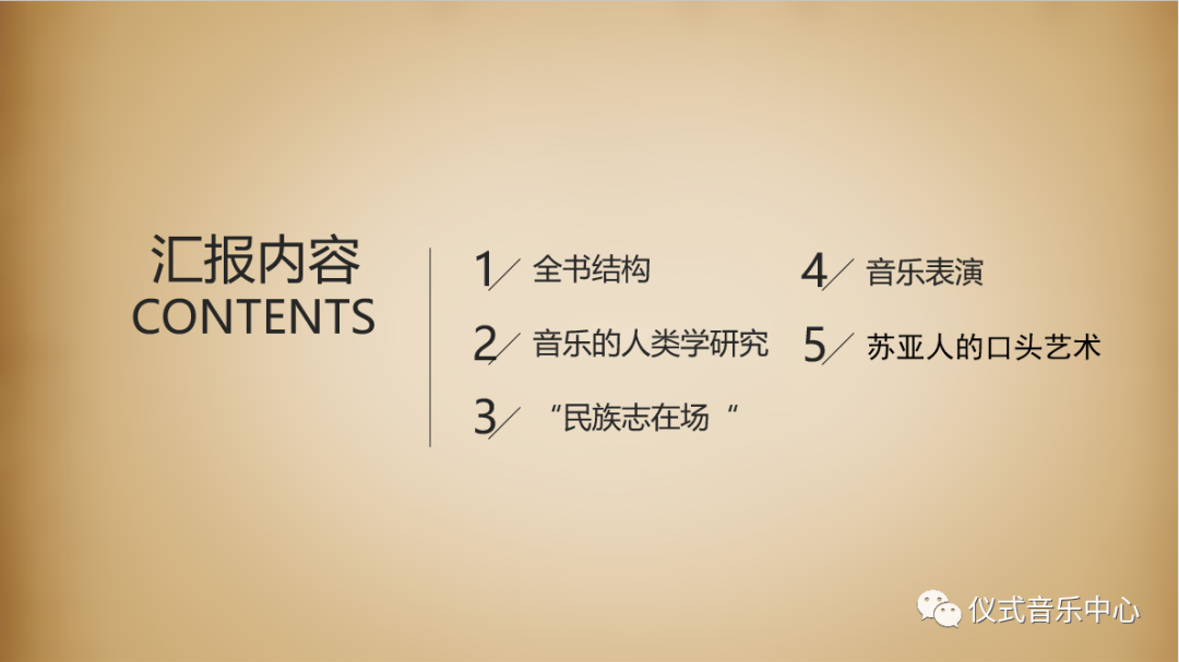 以下是我们此次汇报的五个方面。除介绍全书结构之外,我们从书中提取了四个关键词作为此次汇报的重点内容,分别为“音乐的人类学研究”、“民族志在场”、“音乐表演的分析与阐释”、“苏亚人的口头艺术:从语音到歌曲”。