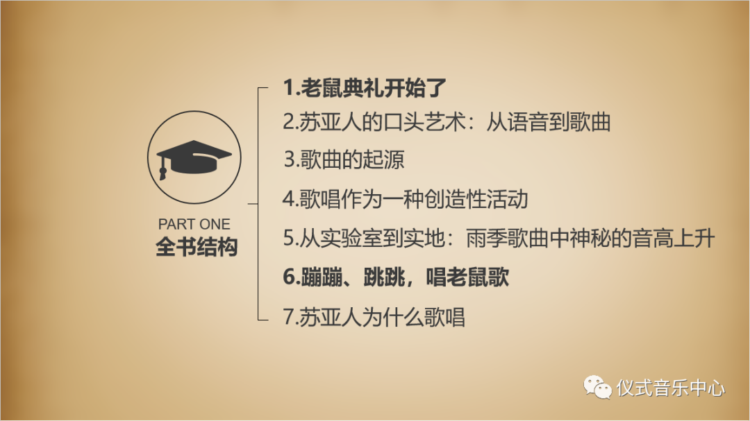 全书共由七个章节构成,其中第1章和第6章是描述与讨论苏亚人“老鼠典礼”的进行过程,第2、3、4、5章讨论了苏亚人音乐表演的相关问题,基于这些讨论,全书最后一章便回到“苏亚人为什么歌唱”这个问题的解答上。