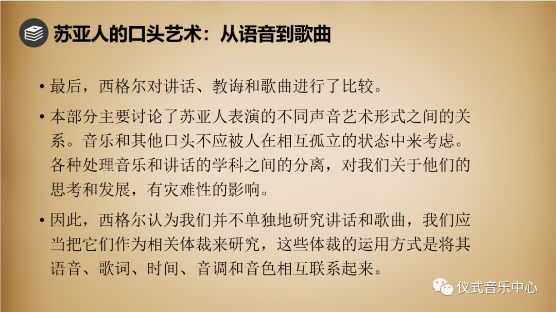 所以,本部分主要讨论了苏亚人表演的不同声音艺术形式之间的关系。于此,西格尔提出,音乐和其他口头艺术不应该在相互孤立的状态中考虑。