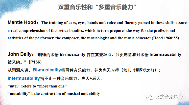 最后,在课堂结束前我想说,当我们要研究他文化音乐的时候,我们说要通过学习掌握一种双重音乐能力。其实从另外一个角度来讲,我们进入音乐学院,我们搞音乐学研究的,比如研究西方音乐,你或许要花一辈子时间学习西方音乐才能做好研究,那凭什么我们研究别的民族就不用去学呢。其实都是一样的,搞西方音乐研究的你不会钢琴怎么能考进音乐学院呢?除非你考的是民乐系。研究西方音乐的人,他们都是从小开始学琴,他们才有资格说我能去研究西方音乐,因为你拿起谱子没办法演奏,你是没办法去研究的,所以说我们现在研究一个我们不了解的或者甚至是我们自己民族的传统音乐,我们都是要去学的。所以这一点不奇怪,对于中国人来讲,如果你的Music是西方植入的,你花了那么长时间把自己变成一个musician,现在又得花大量时间来改造自己,去面对你的传统。所以我觉得我们在座的每一位实际上都具有“Intermusability”。今天的课就到这里,谢谢大家!
