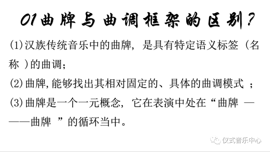 而曲牌与曲调框架的区别在于:(1)汉族传统音乐中的曲牌,是具有特定语义标签 (名称 )的曲调;(2)曲牌能够找出其相对固定的、具体的曲调模式;(3)曲牌是一个一元概念,它在表演中处于“曲牌 ———曲牌”的循环当中。