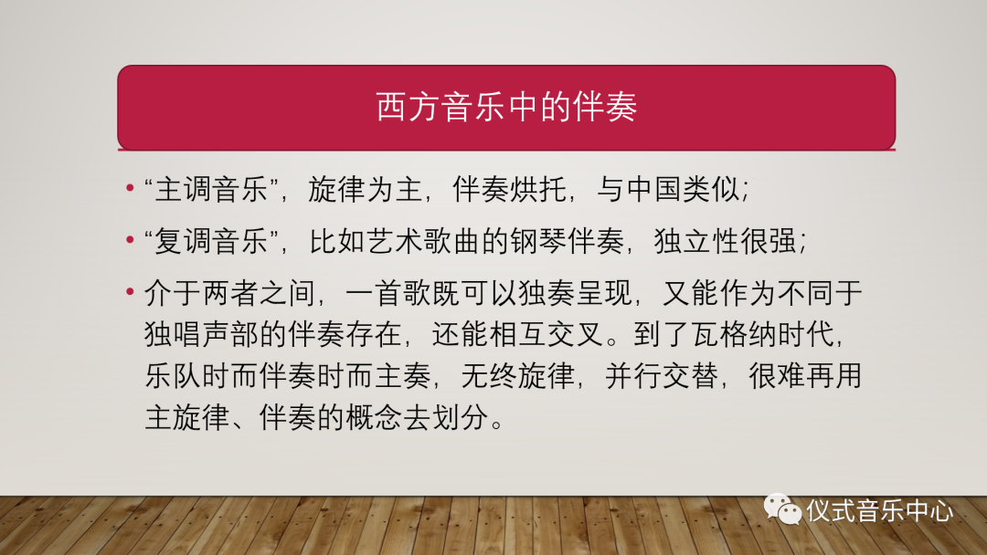 西方伴奏可分三类,一种是“主调音乐”,旋律为主,伴奏烘托,与中国类似;一种是“复调音乐”,比如艺术歌曲的钢琴伴奏,独立性很强;还有一种介于两者之间,一首歌既可以独奏呈现,又能作为不同于独唱声部的伴奏存在,还能相互交叉。到了瓦格纳时代,乐队时而伴奏时而主奏,无终旋律,并行交替,很难再用主旋律、伴奏的概念去划分。