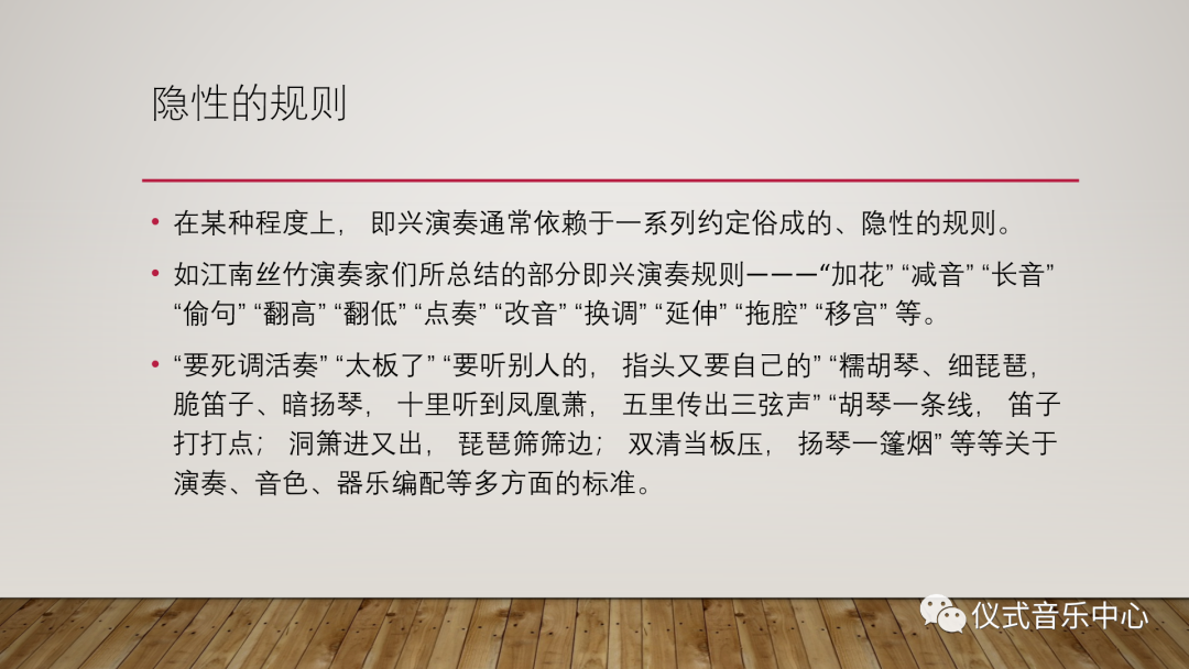 在某种程度上,即兴演奏通常依赖于一系列约定俗成的、隐性的规则。如江南丝竹演奏家们所总结的部分即兴演奏规则———“加花”“减音”“长音”“偷句”“翻高”“翻低”“点奏”“改音”“换调”“延伸”“拖腔”“移宫”等。