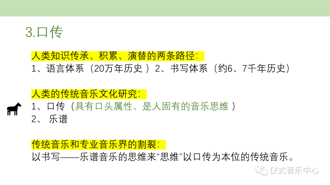 文章首先介绍了人类知识传承、积累、演替的两条路径,即语言体系与书写体系。相应的,人类的传统音乐文化研究路径也有口传(具有口头属性、是人固有的音乐思维 )和乐谱两种。专业音乐学者在实践中,以书写——乐谱音乐的思维来“思维”以口传为本位的传统音乐,造成了传统音乐和专业音乐界的割裂。
