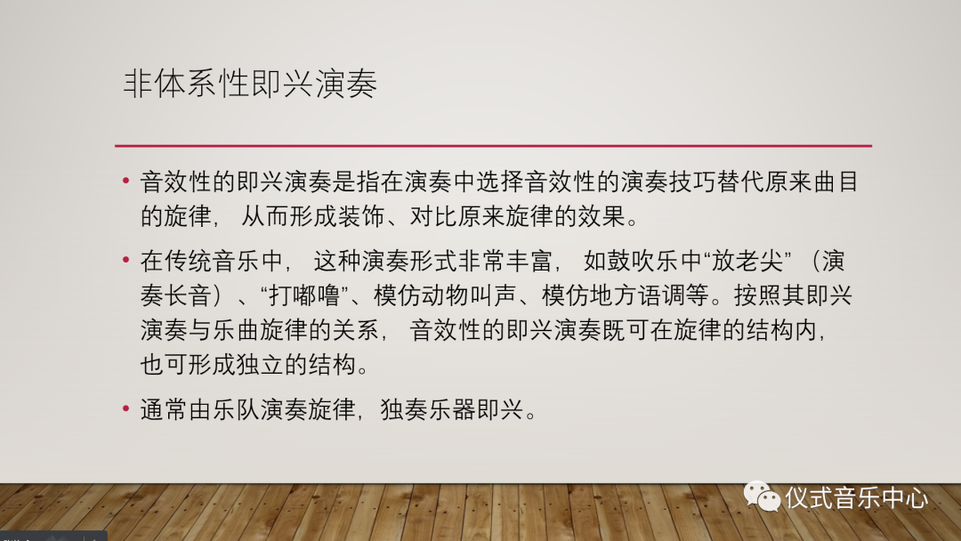 相反,非体系性即兴演奏是指有些乐种里看似并没有统一的、大家都遵循的对旋律进行即兴演奏的技巧体系,而是以多样化的方式存在于各演奏家和流派之间。作者提到非体系性的旋律即兴演奏主要包含两个方面:一是对乐曲基本旋律的润腔及装饰,二是音效性的即兴演奏。所谓“音效性的即兴演奏”是指在演奏中选择音效性的演奏技巧替代原来曲目的旋律,从而形成装饰、对比原来旋律的效果。在传统音乐中,这种演奏形式非常丰富,如鼓吹乐中“放老尖”(演奏长音)、“打嘟噜”、模仿动物叫声、模仿地方语调等。按照其即兴演奏与乐曲旋律的关系,音效性的即兴演奏既可在旋律的结构内,也可形成独立的结构。