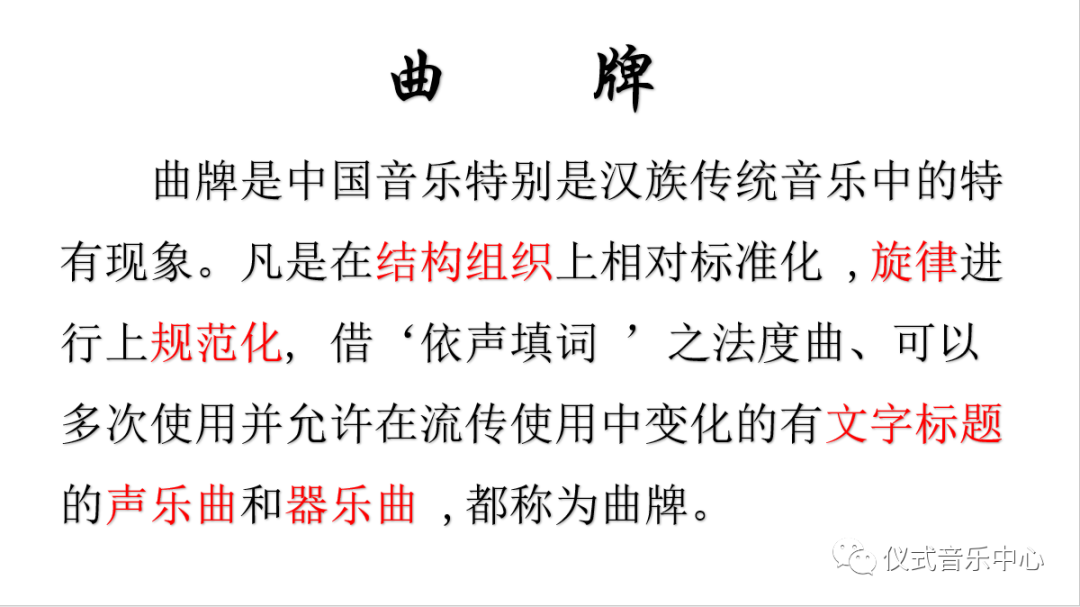 曲牌是中国音乐特别是汉族传统音乐中的特有现象。凡是在结构组织上相对标准化,旋律进行上规范化,借‘依声填词 ’之法度曲、可以多次使用并允许在流传使用中变化的有文字标题的声乐曲和器乐曲,都称为曲牌。