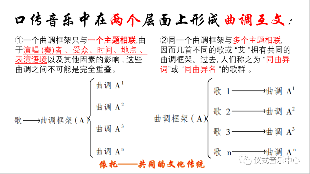 最后,作者提到口传音乐在两个层面上形成曲调互文:1、一个曲调框架只与一个主题相联,由于演唱(奏)者、受众、时间、地点、表演语境以及其他因素的影响,这些曲调之间不可能是完全重叠。2、同一个曲调框架与多个主题相联,因而几首不同的歌或“艾”拥有共同的曲调框架。过去,人们称之为“同曲异词”或“同曲异名”的歌群。总而言之,他们的依托是共同的文化传统。