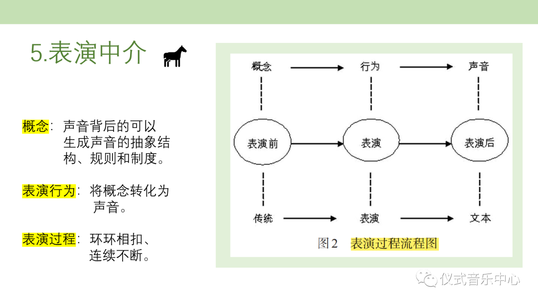 作者给出一张表演过程的流程图,用以展示故事与意义转化为文本,曲调框架转化某个曲调的过程,这些转化都需要表演这个实实在在的行为中介来发生和联结,并且这是一个从“表演前”到“表演”再到“表演后”的过程。梅里亚姆认为,这种转换是一个循环往复的结构关系。表演的经验就是从这里来的,这是一个动态的生成过程,而不是静态的结构分析。其中,概念是处于音乐练习、音乐演奏以及音乐创造背后的基本的东西,是声音背后的可以生成声音的抽象结构、规则和制度。与之相对应的是传统,艺人在传统的前提下,表演生成声音文本。每一次的表演都将之前的传统转化成一个新的文本,这个新的表演和新的文本又为下一次表演和文本生成进行了预备,只要还实施表演的行为,表演的这一个过程就环环相扣连续不断。文中还提到梅里亚姆对“行为”的四种划分法、“概念—行为—声音”的理论等,都是强调思维与实践的统一,这也与口头程式理论和表演理论不谋而合。