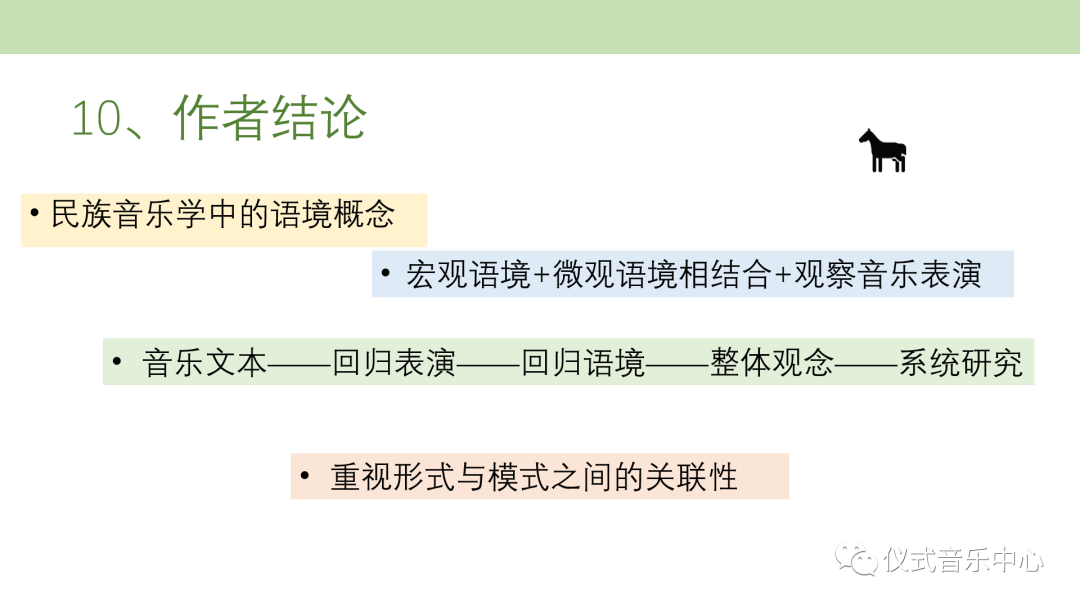 最后,作者得出结论:1、民族音乐学界中语境的概念,同语言学、人类学以及民俗学的语境概念有相同之处,均指语言事象、民俗事象或音乐事象发生的情境和过程。2、只有将宏观语境和微观语境相结合,才能对音乐事件的历史和形态总体把握,同时通过音乐表演的动态过程来观察解答生活在一个特定传统中的人是为何以及如何创造和运用音乐等问题。3、中国民族音乐学者面对浩瀚的口传世界,应将音乐文本回归到它的表演中去,将表演回归到它的语境中去,进行整体观念下的系统研究。4、关注形式与模式之间的关联性,音乐表现形式是丰富多样的,透过形式发觉“背后高度集中凝练并成体系的音乐思维模式”,从而“为每一个个案、每一个具体的表象作出解释”。
