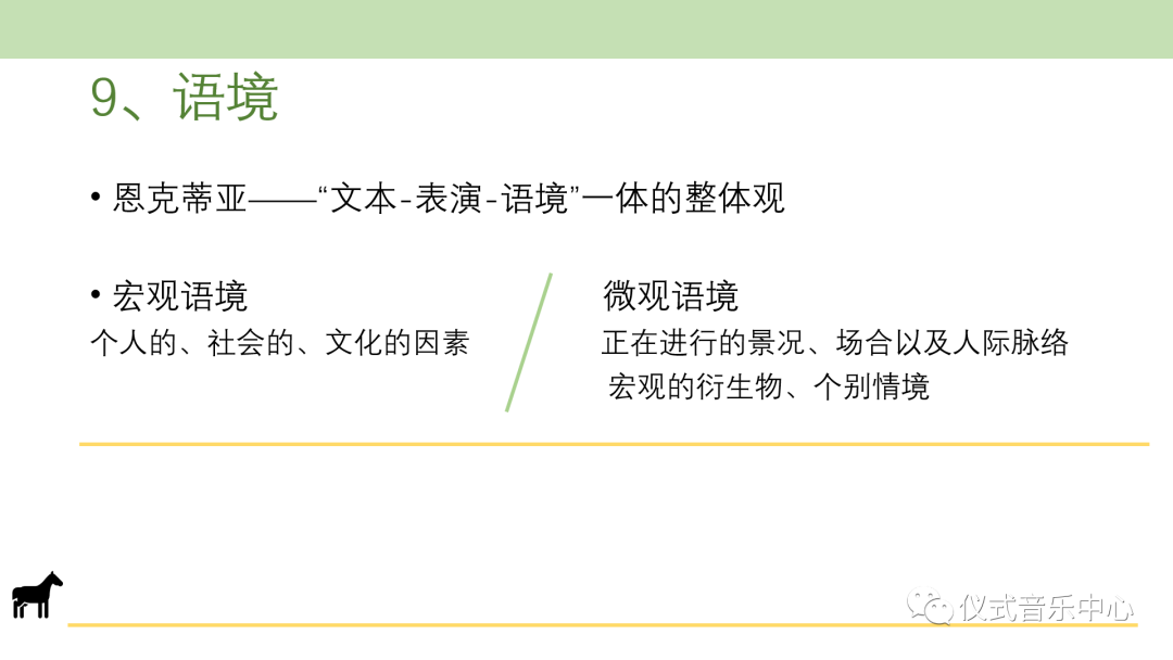 恩克蒂亚提出“文本—表演—语境”为一体的整体观研究思路,强调语境的研究。他认为对语境的研究不仅要把握宏观层面,如乔建中等学者提出的“背景”,包括自然的、文化的、社会的、历史的、经济的、政治的、民俗的、语言(方言)的、群体的、个体的等与音乐相关的关系项之外,还要把握语境的微观层面。微观层面也就是表演的展演场景,包括物质层面上的特定场景、民俗层面上的习俗惯例以及人际层面上的互动模式等。另外,宏观语境包含个人的、社会的、文化的因素,而微观语境是正在进行的景况、场合以及人际脉络,微观是宏观的衍生物,是宏观语境下的个别情境。