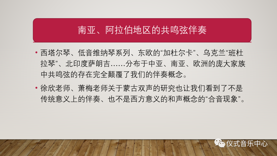 西塔尔琴、低音维纳琴系列、东欧的“加杜尔卡”、乌克兰“班杜拉琴”、北印度萨朗吉……这个分布于中亚、南亚、欧洲的庞大家族中共鸣弦的存在完全颠覆了我们的伴奏概念。徐欣老师和萧梅老师关于蒙古双声的研究也让我们看到了不是传统意义上的伴奏,同时也不是西方意义的和声概念的“合音现象”。
