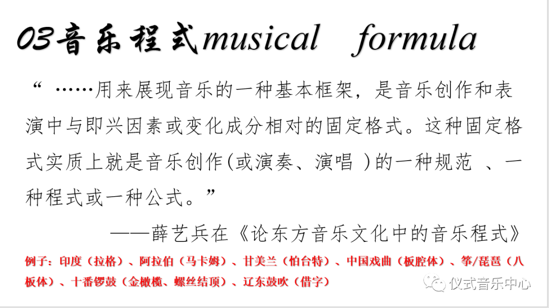 薛艺兵在《论东方音乐文化中的音乐程式》中指出,音乐程式是“用来展现音乐的一种基本框架, 是音乐创作和表演中与即兴因素或变化成分相对的固定格式。这种固定格式实质上就是音乐创作(或演奏、演唱 )的一种规范、一种程式或一种公式。”