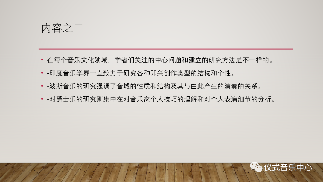 这就引发了第二个内容,在不同的音乐文化领域,学者们关注的中心问题和建立的研究方法是不一样的。如印度音乐学界一直致力于研究各种即兴创作类型的结构和个性,波斯音乐的研究则强调音域的性质和结构及其与由此产生的演奏的关系,爵士乐的研究则集中在对音乐家个人技巧的理解和对个人表演细节的分析。