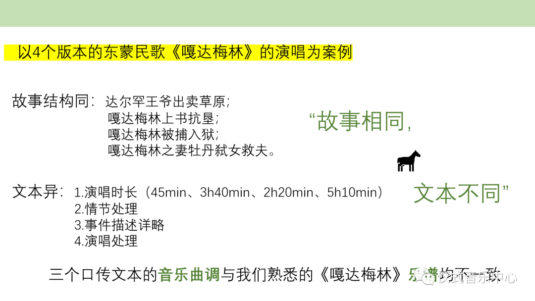 作者继而以东蒙民歌《嘎达梅林》的演唱为例,作者在搜集和录制了科尔沁长篇叙事民歌《嘎达梅林》的四个演唱“版本”后发现,四个版本的故事结构相同,但是长度分别为45分钟、3小时40分钟、2小时20分钟和5小时10分钟不等。通过比较作者发现,故事结构相同的民歌,其演唱文本在时间、细节描述、演唱细节上有较大差异。这就造成了“故事相同,文本不同”的情况。作者比较三个口传文本的音乐曲调与已出版的1952年安波主编出版的《东蒙民歌选》(新文艺出版社)中的《嘎达梅林》乐谱,发现其与三种民间版本乐谱不一样。
