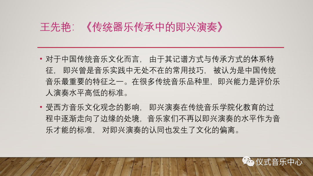 我们小组汇报的最后一篇文章是王先艳老师的《传统器乐传承中的即兴演奏》。对于中国传统音乐文化而言,由于其记谱方式与传承方式的体系特征,即兴曾是音乐实践中无处不在的常用技巧,被认为是中国传统音乐最重要的特征之一。在很多传统音乐品种里,即兴能力是评价乐人演奏水平高低的标准。但自受西方音乐文化观念的影响之后,即兴演奏在传统音乐学院化教育的过程中逐渐走向了边缘的处境,音乐家们不再以即兴演奏的水平作为音乐才能的标准,对即兴演奏的认同也发生了文化的偏离。