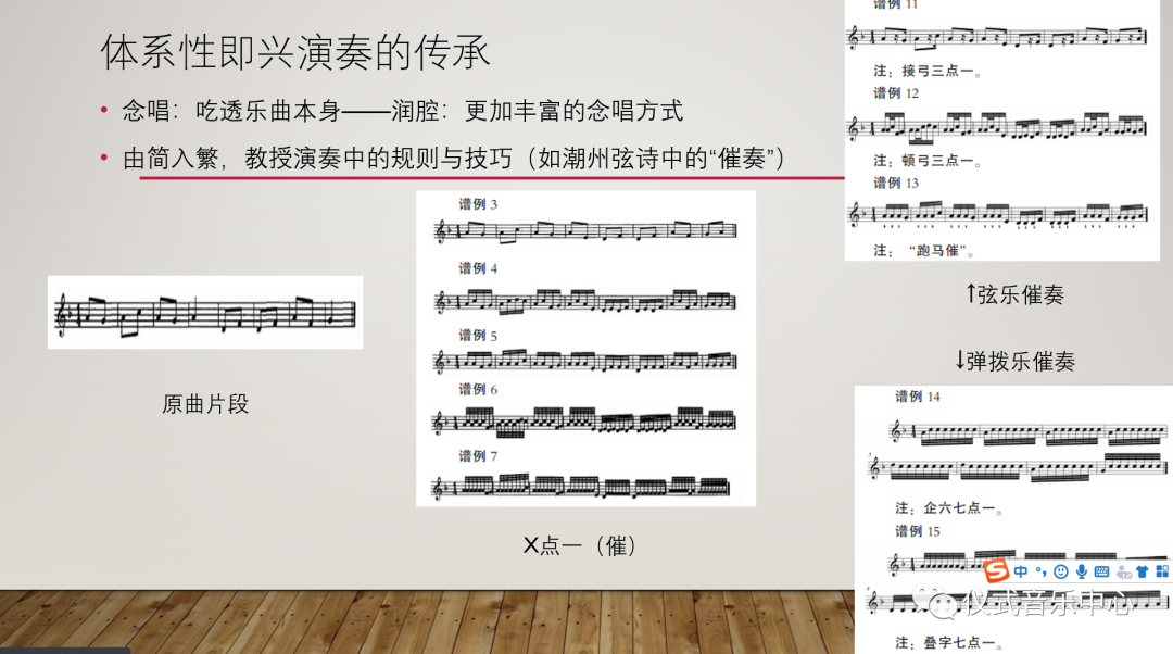 作者在文中将中国传统音乐的即兴演奏分为“体系性即兴演奏”与“非体系性即兴演奏”两种。“体系性即兴演奏”是指有些乐种在旋律的即兴演奏中已经发展为一种体系性的规则,如潮州弦诗中的“催奏”方法,在传承中,学习者只要掌握了这些“催奏”的技巧体系和规则就可以进行即兴演奏,乐人们从而在相同的乐曲演奏中形成不同的“催奏”版本。
