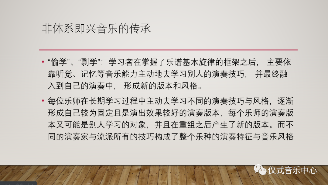 非体系即兴音乐的传承方式主要由学习者在掌握了乐谱基本旋律的框架之后,再依靠听觉、记忆等音乐能力主动地去学习别人的演奏技巧,并最终融入到自己的演奏中,形成新的版本和风格。每位乐师在长期学习过程中主动去学习不同的演奏技巧与风格,逐渐形成自己较为固定且是演出效果较好的演奏版本,每个乐师的演奏版本又可能是别人学习的对象,并且在重组之后产生了新的版本。而不同的演奏家与流派所有的技巧构成了整个乐种的演奏特征与音乐风格。