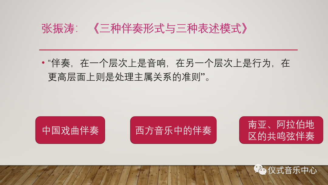 我们小组汇报的第一篇文献是张振涛老师的《三种伴奏形式与三种表述模式》。作者在摘要中提到“伴奏”的概念:“伴奏,在一个层次上是音响,在另一个层次上是行为,在更高层面上则是处理主属关系的准则。”作者选取了“中国戏曲伴奏、西方音乐中的伴奏以及南亚、阿拉伯地区的共鸣弦伴奏这三种不同文化中的不同伴奏模式来从音乐形态的不同继而引申至文化模式的不同。