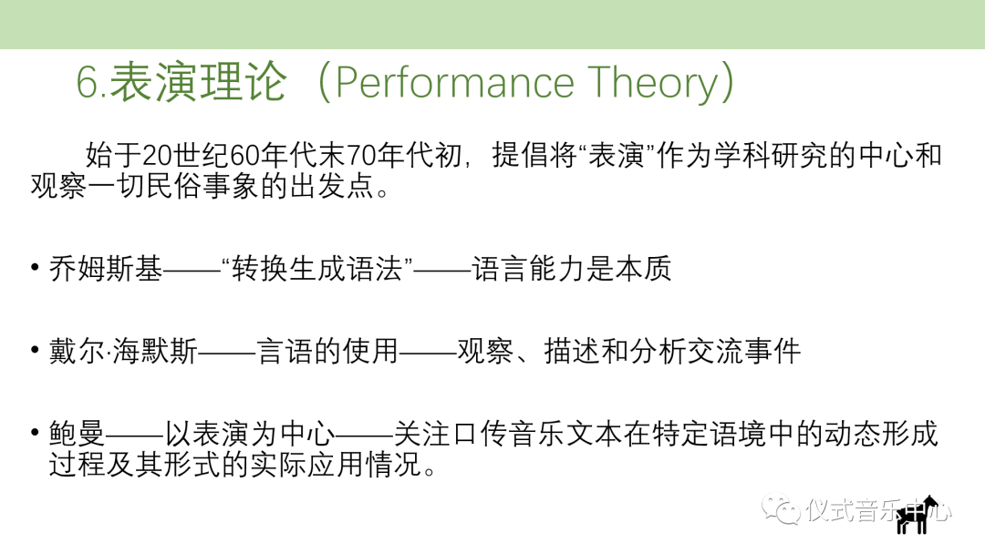 表演理论(Performance Theory)始于20世纪60年代末70年代初,提倡将“表演”作为学科研究的中心和观察一切民俗事象的出发点。这是受到乔姆斯基“转换生成语法”思想的影响,他将语言能力和语言运用二分,认为语言能力是一种人类内化的语言规则,它是本质的,要从语言的普遍规律出发来探索。美国语言学家、民俗学家戴尔·海默斯认为应该关注言语的使用,强调对交流事件的观察、描述和分析。表演理论的代表人物鲍曼则将这些观点集合起来,形成了以表演为中心,关注口传音乐文本在特定语境中的动态形成过程和其形式的实际应用情况,而不是停留在单单以文本声音为对象的静态研究上。鲍曼认为,表演是一种说话的模式,交流的方式,是在不同的语境中生成不同的文本,进而形成独特的事件,表演者在这个过程中也获得了新的角色含义。