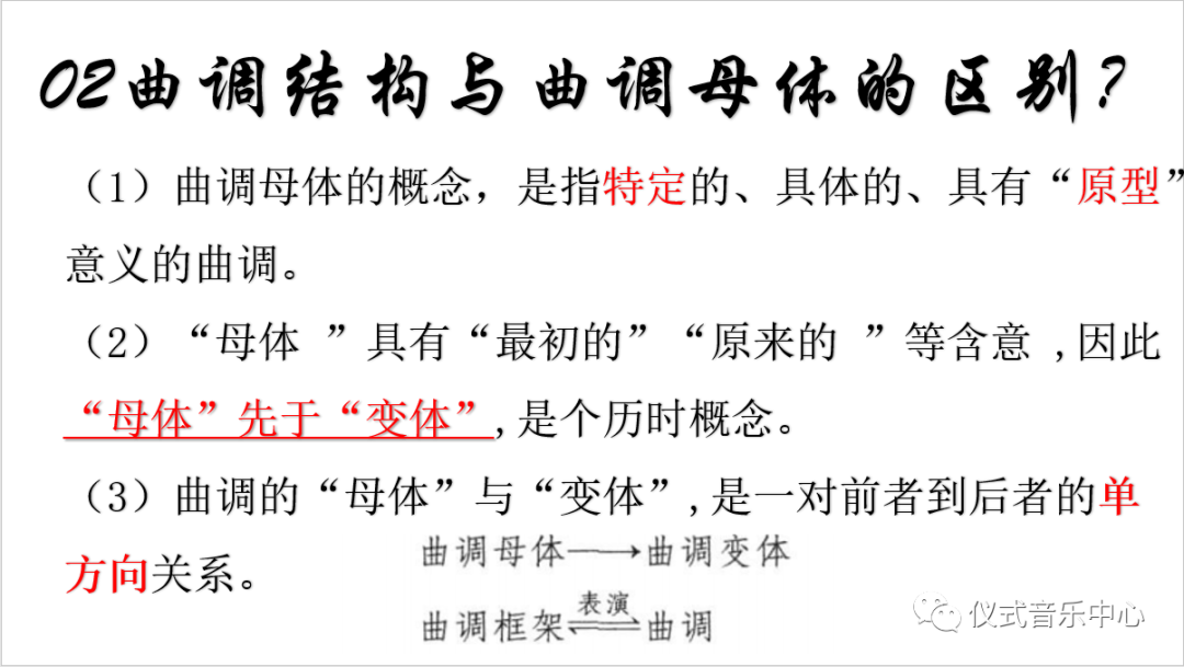 曲调结构与曲调母体的区别体现在:(1)曲调母体的概念,是指特定的、具体的、具有“原型”意义的曲调。(2)“母体 ”具有“最初的”、“原来的”等含意,因此“母体”先于“变体”,它是个历时概念。(3)曲调的“母体”与“变体”,是一对前者到后者的单方向关系。
