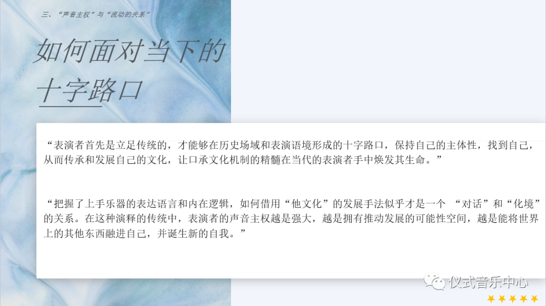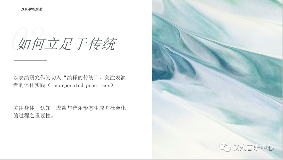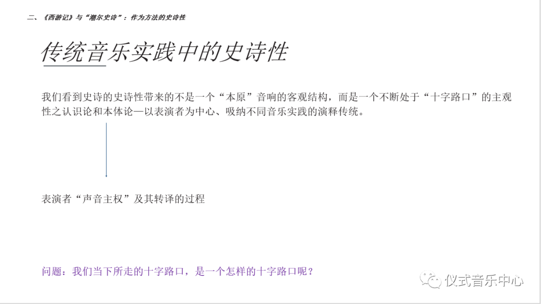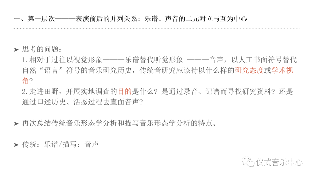 之后作者用这张图表对比进一步说明了这两种分析范式的不同,传统是基于乐谱,分析起点为表演前的分析方法。描写是基于田野,分析起点为表演后的采风记录,让我们直面音声的分析方法。作者在一部分结语中提出了两个让我们去进一步思考的问题,如下方PPT中所示。