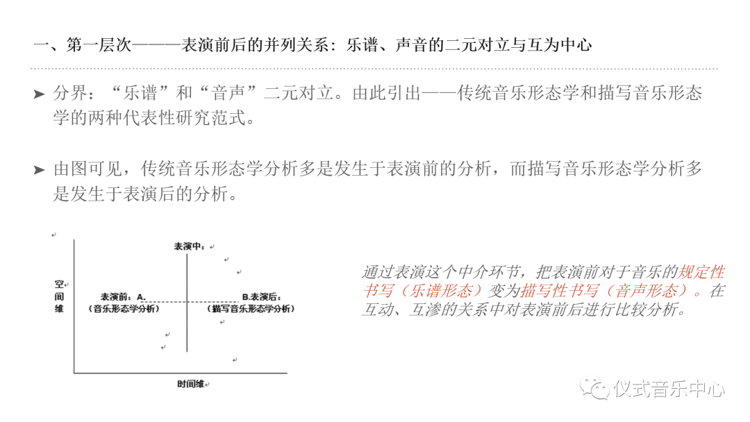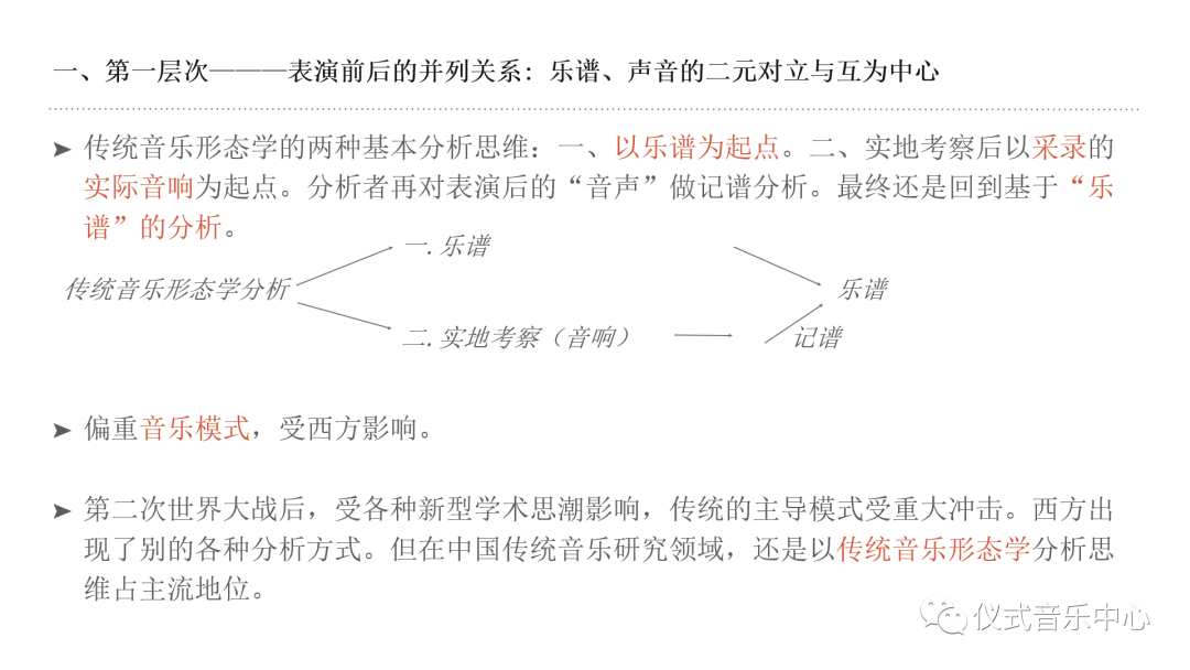 之后,作者论述了第一种研究范式,即以乐谱为起点的“表演前”研究——传统音乐形态学分析,这种研究范式主要来自西方的谱系统音乐。传统音乐形态学的两种基本分析思维分为:1、以乐谱为起点,2、实地考察后以采录的实际音响为起点。之后,分析者再对表演后的“音声”做记谱分析,最终还是回到基于“乐谱”的分析。但这种分析方式在二战后受到冲击,西方出现了其他分析方式,但在中国传统音乐研究领域,还是以传统音乐形态学分析思维占主流地位。
