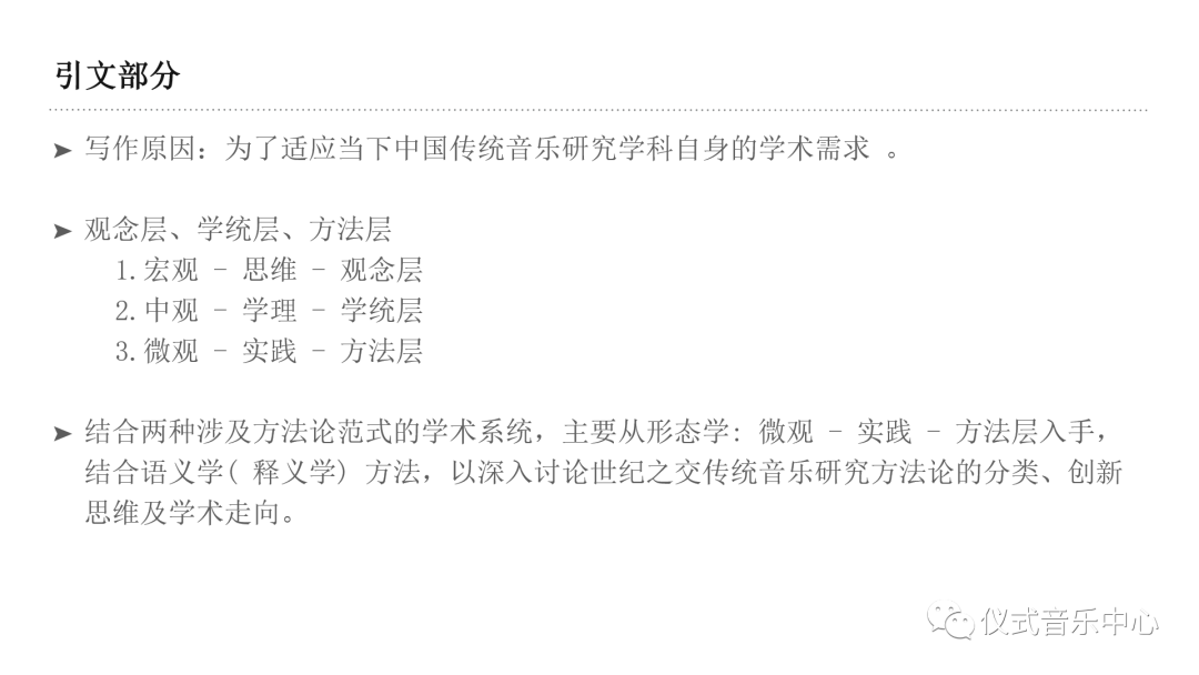 大家好,我们小组汇报的第一篇文章是杨民康老师的《以表演为经纬——中国传统音乐分析方法纵横谈》,全文以表演为经纬结合各种实例及图表向我们讲述了中国传统音乐目前存在的一些研究范式。