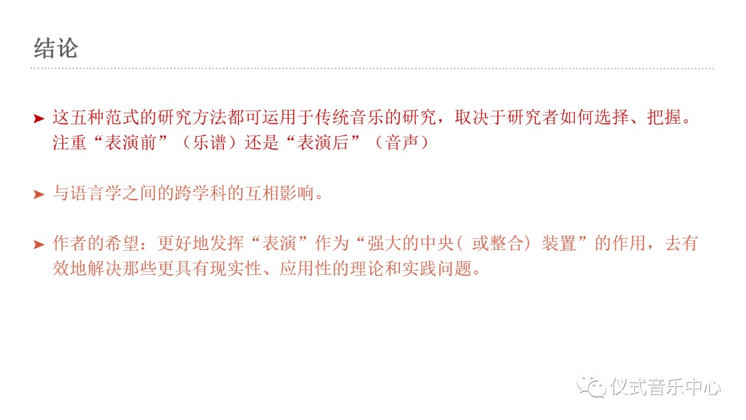 作者在结论部分中表示,文章中这五种范式的研究方法都可运用于传统音乐的研究,取决于研究者如何选择、把握。是注重“表演前”(乐谱)还是“表演后”(音声)。作者还说明了这些分析思路与语言学之间的跨学科影响。最后他提出了他的希望,他希望研究者更好地发挥“表演”作为“强大的中央(或整合)装置”的作用,去有效地解决那些更具有现实性、应用性的理论和实践问题。