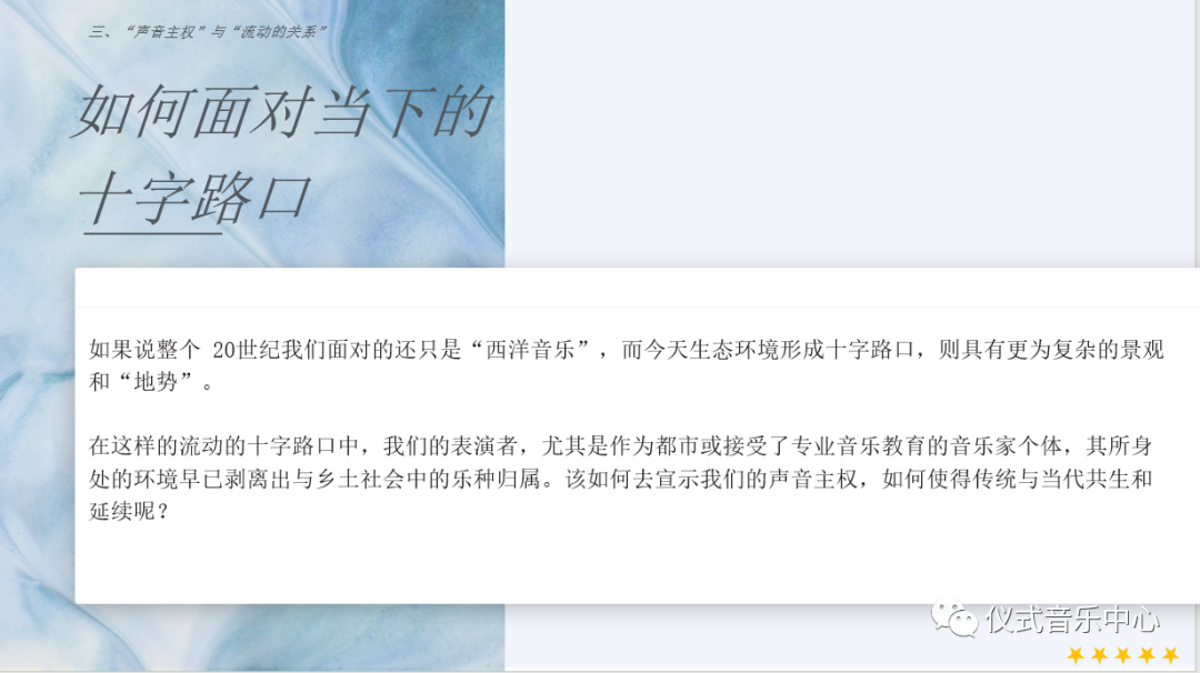 这就是我们在当下遇到的十字路口,它和以往相比,极具流动性。那么在这样的十字路口,我们该如何去宣示我们的声音主权,如何使得传统与当代共生和延续呢?这就要进入作者第三章的内容。