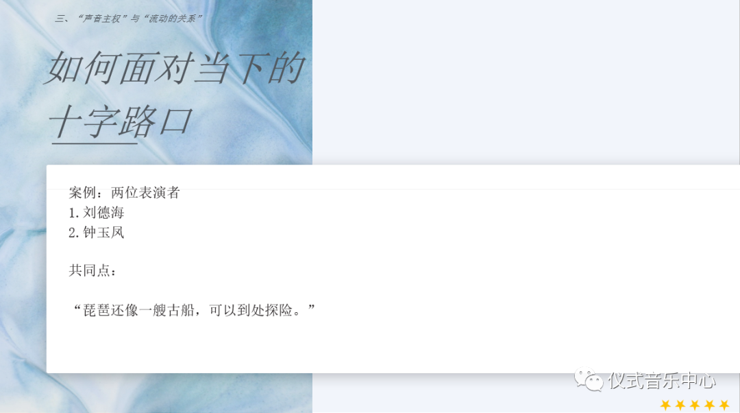 作者在文中例举了刘德海、钟玉风两位表演者这两位表演者。他们的共同点,我认为是作者文章中提到的钟玉凤的一句话,“琵琶还像一艘古船,可以到处探险。”