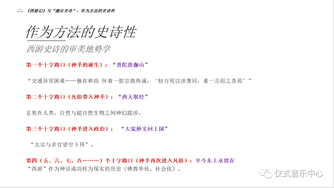 我想打乱文章章节的顺序,以我自己理解的思路来汇报萧梅老师的这篇文章,这也是一个“转译”的过程。拆解后的顺序为:第二章——第一章前半部分——第三章——第一章后半部分。“《西游记》与‘潮尔史诗’:作为方法的史诗性”,这是作者的第二章。要从2019年Bolman来上海音乐学院做的相关音乐史诗的讲座开始说起。在那次一次讲座中,Bolman将西游记作为史诗,来解释他所提“审美地势学”(aesthetic topography)中的十字路口。文中提到Bolman一共展现了四个十字路口。如ppt所示,玄奘选择西行的那一刻便是第一个十字路口,史诗的神圣之旅就此诞生;第二个十字路口便是玄奘西行路途中遭遇各路妖魔鬼怪,这一过程使凡俗带入神圣;第三个路口,玄奘取经归来,大唐天子与百官“望空下拜”,是神圣进入政治的时刻;而后,便是第五、六、七、八……乃至无数个路口,这段传奇故事在不同的历史时刻被不同的人不断地转述、改造、重塑。